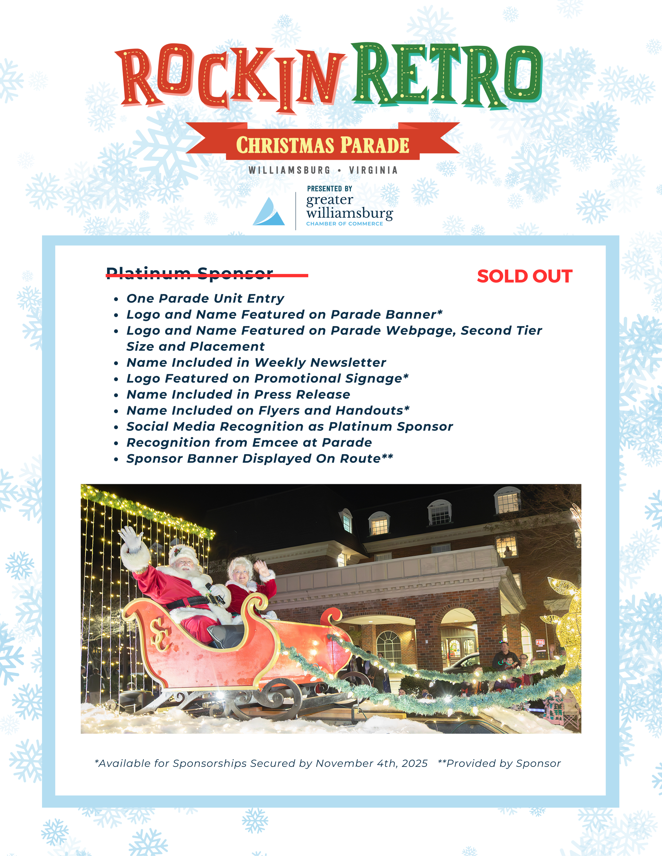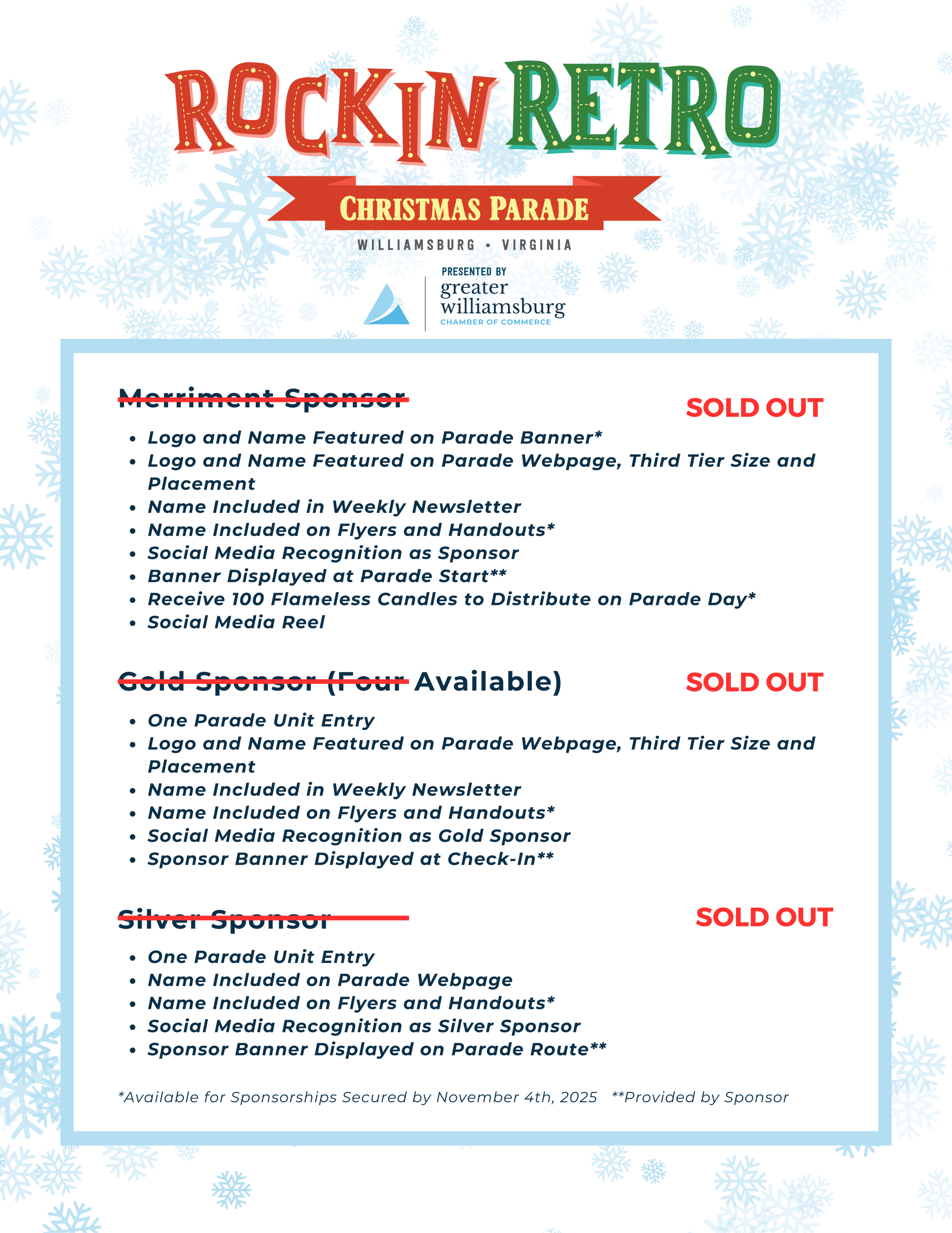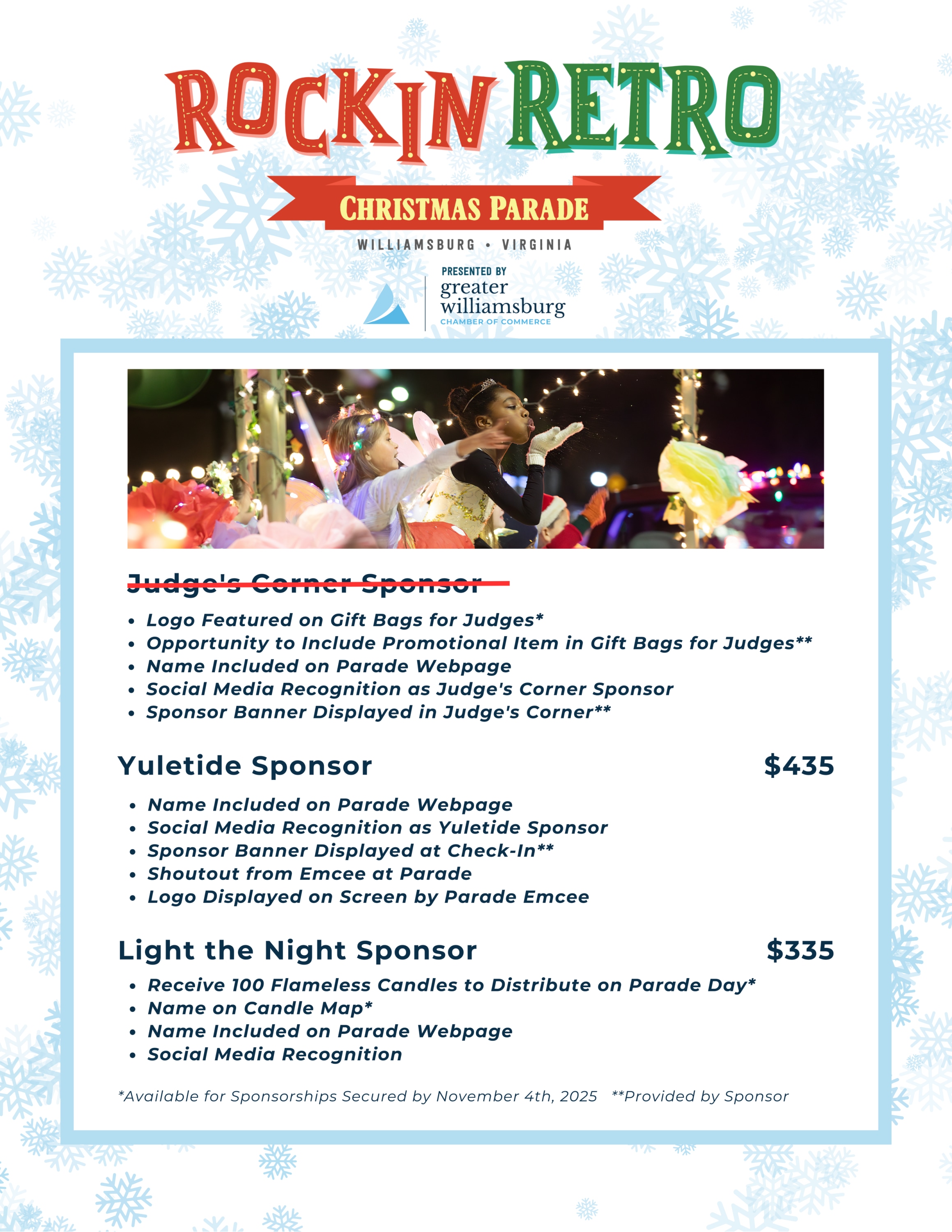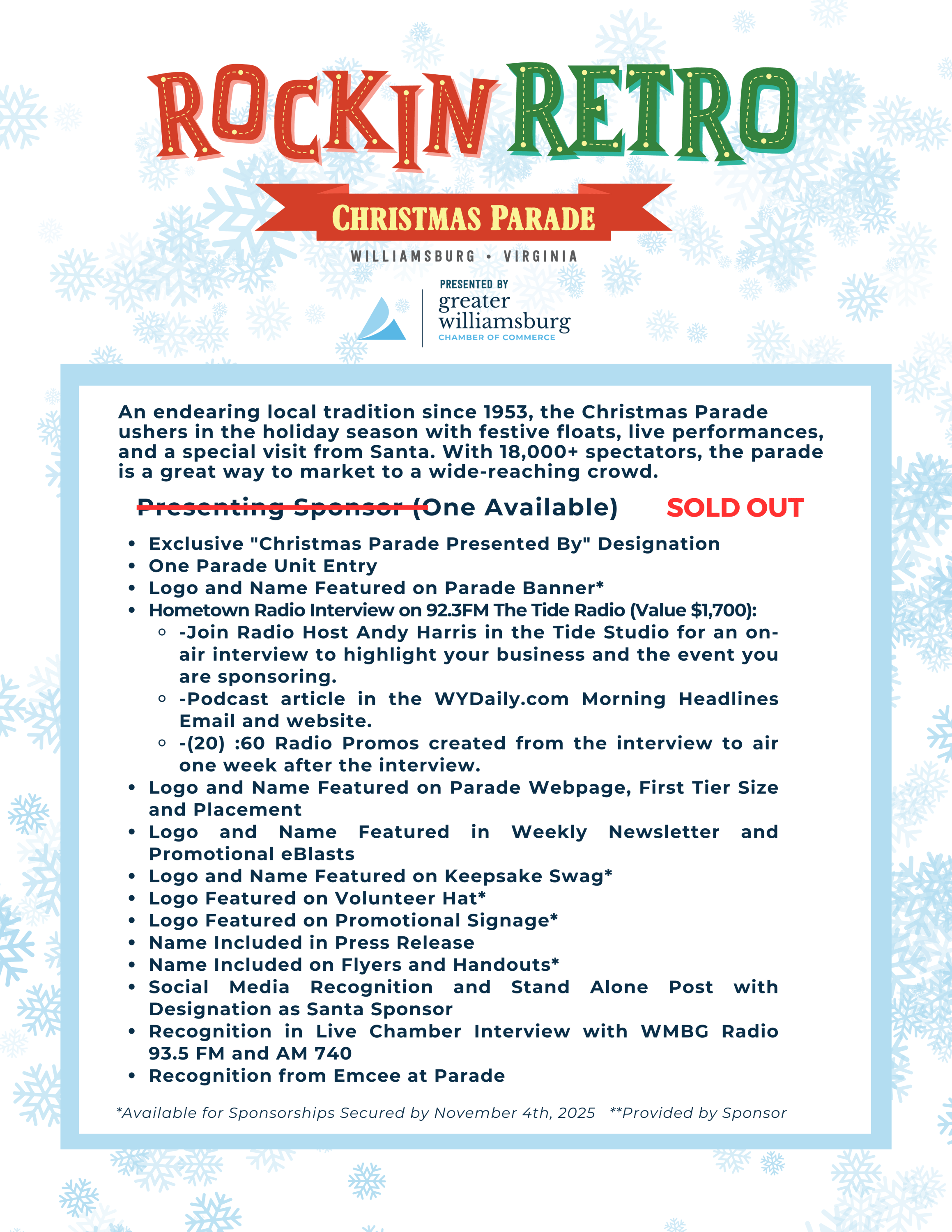 Align your brand with one of Williamsburg's most cherished holiday traditions! Sponsoring the Christmas Parade offers unparalleled brand visibility to over 18,000 spectators and demonstrates your commitment to giving back to our vibrant community.